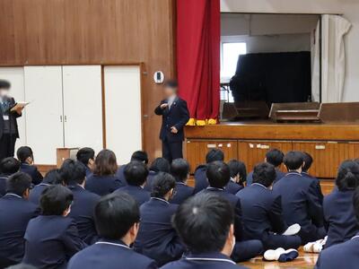 修了式では、修了証渡しがあり、各科各学年の代表の生徒が修了証の授与を受けました。校長講話では「1年の振り返り」「春休み期間中に注意すること」「4月から1つ上の学年として成長していってほしい」「新年度元気に来てください」などの話がありました。最後に全員で校歌を斉唱し式を閉じました。