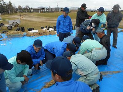 12月5日(木)に鏡町に在住の黒木直志様を講師にお招きして、農業科2・3年生13人がしめ縄作りを行いました。2年生は初めてのしめ縄作りでしたが、講師の方に手伝ってもらったり、先輩と協力したりしながら楽しく取り組むことができました。3年生は2回目の製作でした。作業を進めながら徐々に去年のことを思い出してきたようで、手際よく製作することができました。形を整えたり、飾りを付けたりしていくとどんどん豪華になっていき、実際に飾ることを想像しながら作り上げていくことができました。学校用のしめ縄作りでは、3m程のしめ縄を作りました。みんなでボサボサとはみ出している藁を切ったり、バランスを整えたりしました。しめ縄作りを通して日本の風習や意味などを知ることができました。自分たちで製作したしめ縄を玄関に飾り、よいお正月にしてもらいたいと思います。
