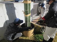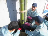 12月13日(水)に本校正門と鏡町区コミュニティーセンターに門松を作り設置しました。竹を切る際には、みんなで相談しながら切る角度を決めたり、切る人と竹を押さえる人に分かれ協力して取り組む様子が見られました。鏡町区長様や地域の方にも見守っていただきながら楽しく製作しました。竹の向きや全体的なバランスを考えながら松や梅、南天、葉牡丹で飾りつけをしていくにつれ、豪華で迫力のある門松になっていき、生徒達は喜んでいました。今年は暑い日が続いたことで年末という雰囲気がなかなかありませんでしたが、門松やしめ縄を作ることで実感が湧いてきたと生徒同士で話していました。