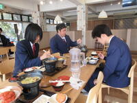 1日目は、阿蘇火山博物館、熊本城、アミュプラザくまもと見学と、宿泊ホテルでのテーブルマナー教室を実施しました。現地ガイドの方の話を真剣に聞いたり、買い物を楽しんだりとメリハリのついた研修をすることができました。テーブルマナー教室では、緊張していた生徒も若干いましたが、しっかりとテーブルマナーを身につけることができました。