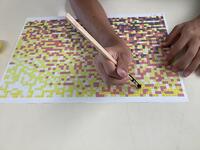 普通科2年生は、美術の時間に「モザイクアート」を制作中です。A3の用紙1枚、縦64マス×横43マス、合計2752のマス目に指定された色を付けていきます。生徒は集中して、マス目からはみ出さないように丁寧に絵の具で色を付けていきます。準備されている用紙は全部で90枚。すべての用紙に色付けが終わったら、90枚すべてを貼り合わせて完成!!完成したもの(完全版)は、わかあゆ祭で披露される予定です。乞うご期待。
