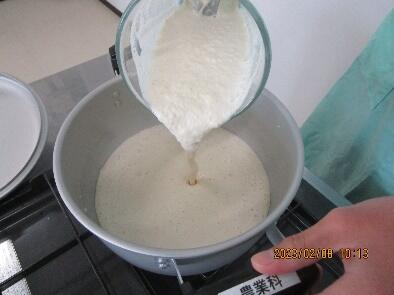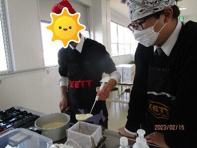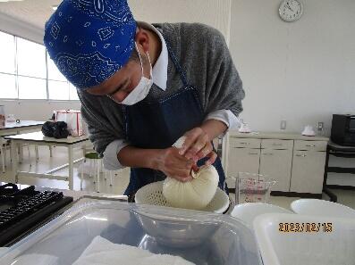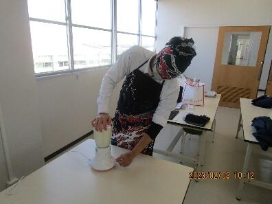 令和5年2月8日と15日に農産物の食品加工ということで、今回は豆腐作りを行いました。工程は水に浸けておいた大豆をミキサーでペースト状にし、煮込んだ後おからと豆乳に分け、豆乳ににがりを加えてさらに煮込み、型に流し込んで固まるまで重しを乗せて作り上げました。大豆の重さに対して水をどれだけ入れるか計算したり、鍋底を焦がさないように長時間へらで混ぜ続けたりと様々な工程を一人一人が丁寧に取り組むことができました。また、途中でおからや寄せ豆腐などの試食もしました。完成した豆腐は市販のもののように滑らかな見た目ではありませんでしたが、みんな食べた後に「美味しかった!」「ネギと一緒に食べたかった!」などと言って喜んでいました。農業科は課題研究として一人一人、夏と冬に大型プランターなどで自分が好きな野菜をそれぞれ育てており、今年エダマメを育てた生徒もいました。友達の野菜もみんなで観察し合っていたので、エダマメが大豆になり、大豆から豆腐が作られることを体験的に学ぶことができました。