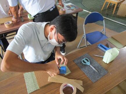 好きな縁(へり)の模様を選び、床と畳表と縁を順番にタッカーで止めていきました。畳表や縁は引っ張りながら止めるため苦戦する生徒もいましたが、スタッフの方に協力していただきながら上手に止めることができました。1時間程度で全員が作り上げることができ、自分が作ったミニ畳を嬉しそうに手に取っていました。