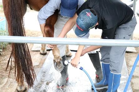 令和4年10月6日、専門学科農業科2・3年生が松橋町にあるブリティッシュ&ウエスタン乗馬HORSE RIDER(ホースライダー)で厩舎作業体験を行いました。初めは二人一組(ポニーは一人)で馬房から馬を出し※1曳き馬(ひきうま)を行いながらスキンシップを図りお互いの緊張をほぐしていきました。生徒たちの半分以上はこの時間で緊張が和らぎ笑顔が見られるようになりました。その後、※2調馬索の体験をしました。生徒たちは、ドキドキしながらも自分で馬を動かしていることが嬉しかったようです。その後に行った馬の手入れでは、足を上げて蹄を洗う作業に苦戦する生徒が多く、馬の手入れの難しさを肌で感じることができました。生徒たちは、なかなか体験することができない作業をたくさん経験し、生き物を飼育する大変さや命の尊さを学ぶ貴重な機会を得ました。
