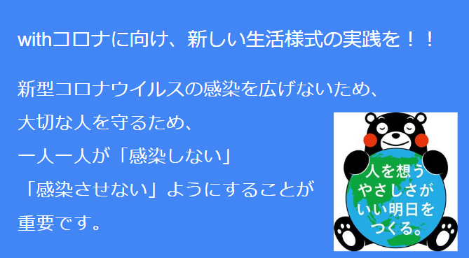 1月10日(火)に、健康教育『新型コロナウイルス対策~くまモンと新しい生活様式を学ぼう~』を実施しました。熊本県が呼びかけている「く・ま・も・と・けん」をあいことばに、換気やマスク着用、手洗いの大切さなどを学びました。生徒たちは、くまモンが登場するYouTubeを真剣に見入っていました。新型コロナウイルスは変異しながら、私たちの生活を脅かしてきます。withコロナに向け新しい生活様式を実施しながら、元気に3学期を過ごしてほしいと思います。