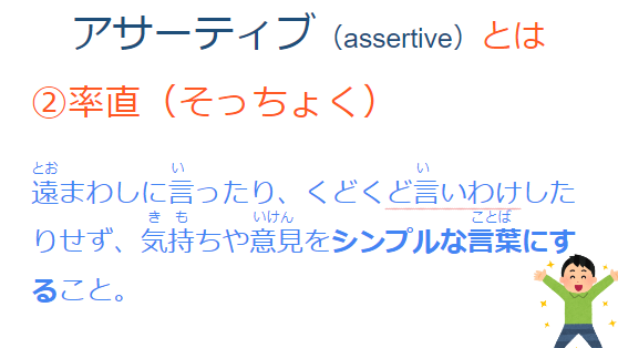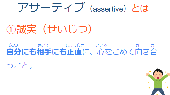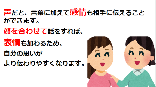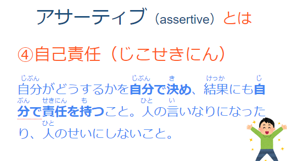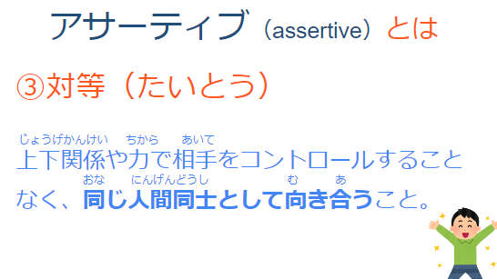 今回は、『アサーティブにかかわろう』というテーマで、「相手を尊重しながら適切な方法で自分の気持ちを伝えるとはどういうことか」をみんなで一緒に考えました。アサーティブに関わる4つのポイントを紹介すると、しっかりと画面を確認し復唱する生徒もいました。アサーティブではない関わり方とアサーティブな関わり方の具体例を、寸劇を見ながらそれぞれ自分が言われたときの気持ちを考えることで、「相手を尊重しながら適切な方法で自分の気持ちを伝える」とは、「相手も自分も嫌な気持ちにならない」ことだと気付くことができました。