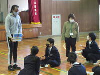 2つ目の活動は、借り物伝言ゲーム。内容は、クラス毎に一列に並び、先頭の生徒がクィン先生から英語で物品に関する説明を聞き、最後方の生徒は伝わってきた情報を元に、正解の物品を体育館の中から探し出します。英語の説明を聞き取る、そして次の人に伝える難しさがあり、お題がバトミントンのラケットだったのに持ってきた物はバトミントンの羽根だったりと、答え合わせの時には笑い声が聞こえていました。