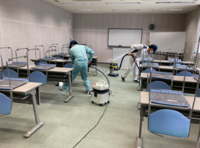 12月14日(木)の1~4校時目に、流通・サービス科2・3年生の生徒たちが地域貢献活動として、鏡町の愛鏡祭や鏡文化祭などの催しが行われている鏡文化センターの清掃活動を行いました。本学科では「清掃」の授業にも取り組んでおり、ダスタークロスをはじめ様々な道具の使い方、ガラス面洗浄作業やトイレ日常清掃作業など、清掃手順を実践させていただける貴重な実習となりました。床清掃では、教室や実習室などの空間での除塵作業を行っていますが、文化センターのホワイエはとても広く、どのような手順で清掃すれば良いのか、生徒たちが相談する場面が見られました。ガラス面洗浄作業も、学校にない大きな窓ガラスを慎重に洗浄し、トイレ清掃では、いくつもある便器を時間内に終わるようにスピードを上げて清掃する様子が見られました。