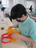 普通科・工芸班では、帆布のバッグ類やコースター、アクリルたわし、古着を再利用したラグマットなどを制作しています。バッグ類は、刺し子をした布に、ミシンで縫製して仕上げます。アクリルたわしは、アクリル毛糸をリリアンで紐状に編み、それを渦巻き状にとじつけて円形に成形します。ラグマットは、古着をリボン状に切ったものを、すべり止めマットに結びつけて作ります。6月になり、1年生も2、3年生を見習って制作をがんばり、それぞれの作業が上達してきました。