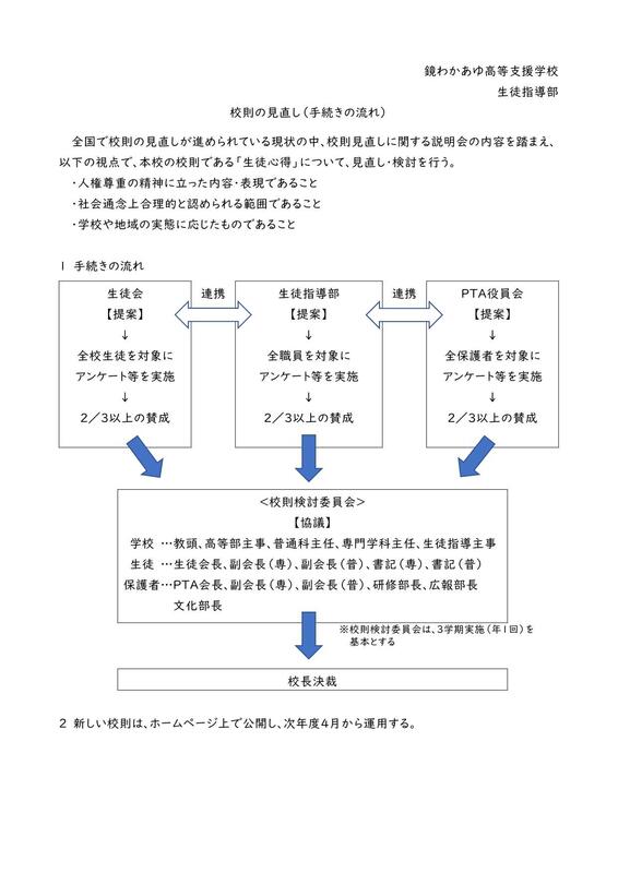「鏡わかあゆ高等支援学校 生徒心得」の改定につきましては、以下の手順及びスケジュールで取り組むことにしています。
