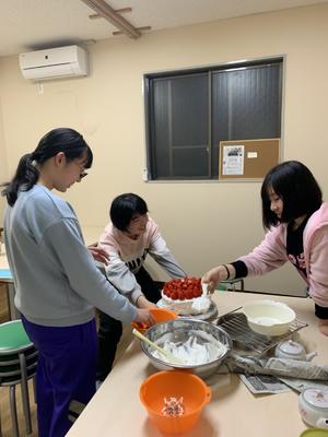 初めての夕飯では、女子3人で中畠さんからいただいたイチゴを使ってケーキを作りました。