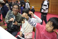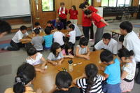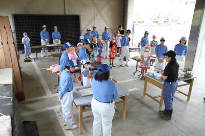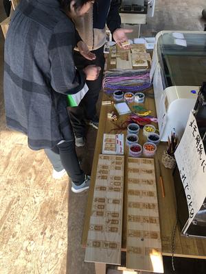 本校演習林の間伐材(スギ)を利用した1辺が3cmの積み木にくまモンのシールを貼るという体験で、