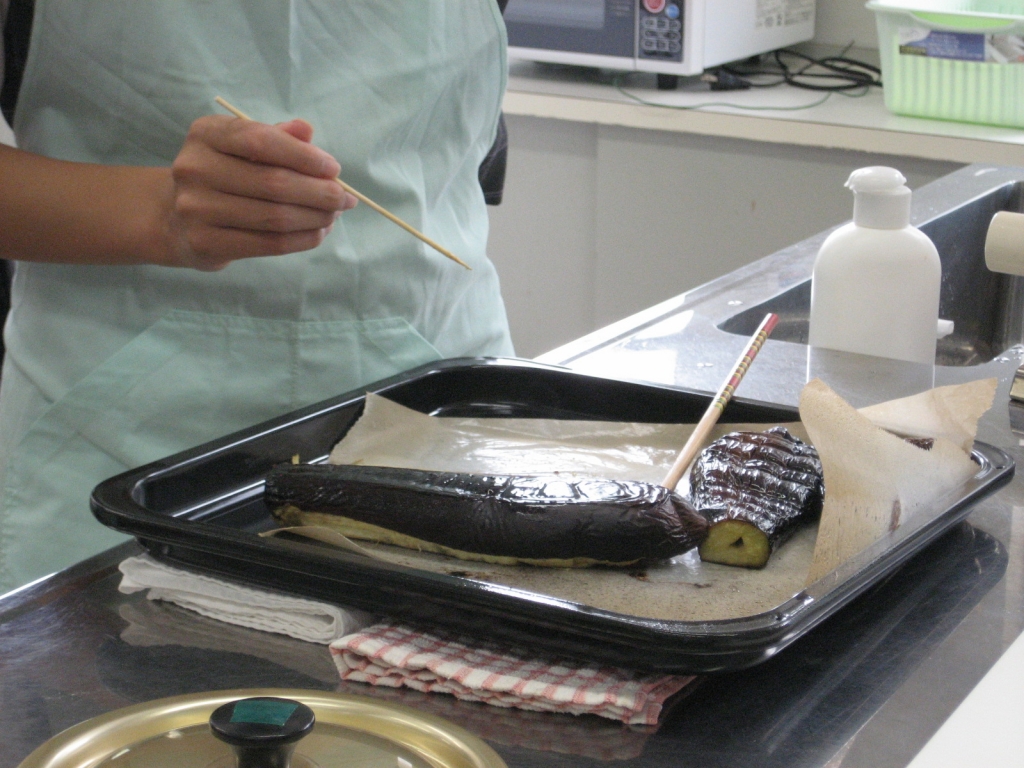 新鮮でおいしいなすびはそのまま素材の味で食べるのが一番!ということで焼きなすを作りました。学校でとれた食材を使って料理をするとよりおいしく感じます。