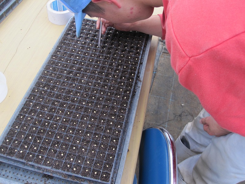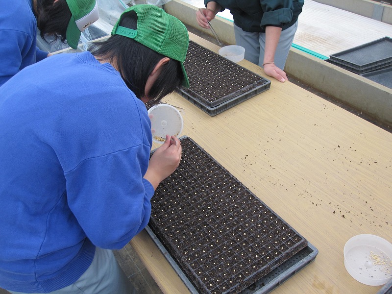 食農科学科では、4月下旬に予定している苗販売会用の野菜の播種を始めました。この日はピーマンをセルトレイにピンセットを用いて1粒ずつ丁寧に播いていきました。