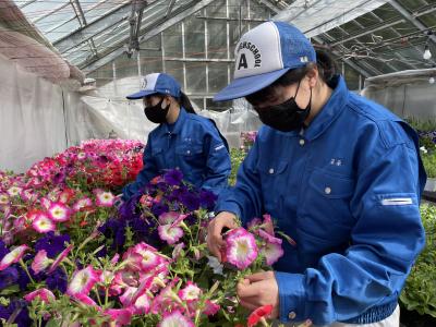草花部門ではペチュニアの出荷準備を行いました。ペチュニアは4月6日(火)から15日(木)に実施される春の全国交通安全運動でドライバーに配られます。この日は花がらを摘んだり、下葉かきをして見栄えを良くしました。
