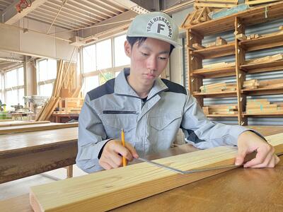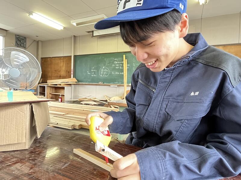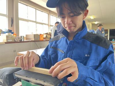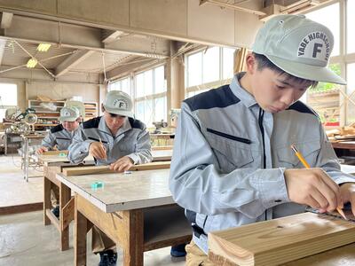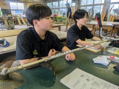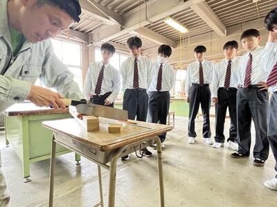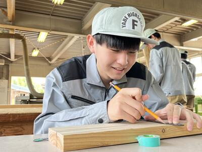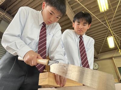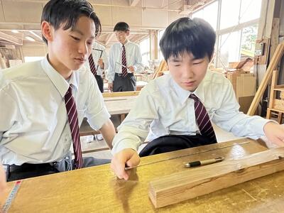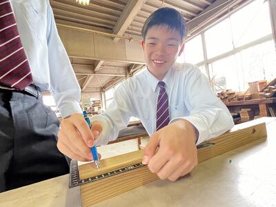林業科学科1年生の初めての「総合実習」は、「さしがね」と「のこぎり」の使い方について学習しました木材加工の基礎基本となる大切な学習で、生徒たちも初めて触れる大工道具に興味津々でした