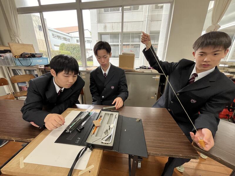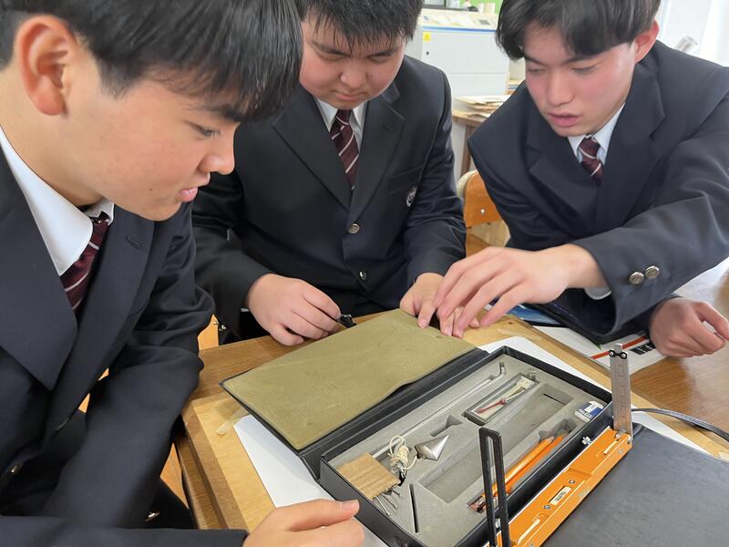 6限目には、「平板測量」の器械・器具に触れました初めて見るものに興味津々の生徒たち