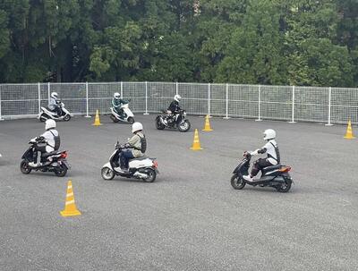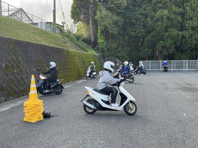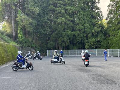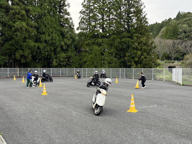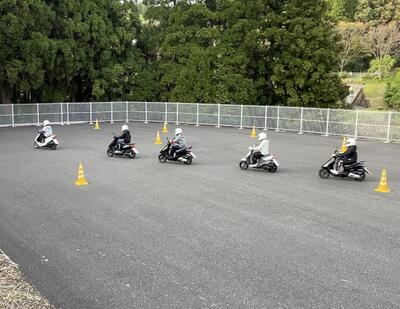 二輪車競技部の活動が行われました今日は、本田監督の指導のもと8の字の練習。免許を取得した2年生や入学したばかりの1年生も原付バイクに乗車し、運転を体験しました