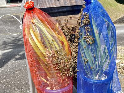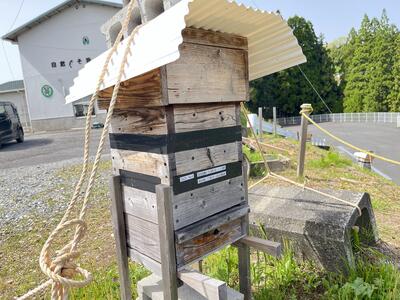 巣箱の手前の花は、ミツバチが大好きな「キンキョウヘン」という花。分蜂の様子をしっかりキャッチできるように、ミツバチ班の生徒・職員は観察を続けています