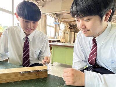 林業科学科5・6限目の授業は、2・3年生合同で実習を行いました通潤パズルの製作を3年生が2年生に教え、共同でパズルを製作