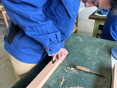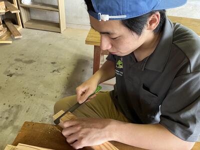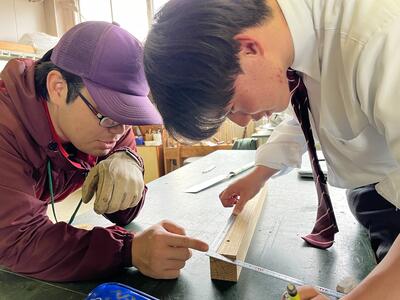 山川先生にさしがねの持ち方、測り方、線の引き方に加え、のこぎりの使い方を学びました