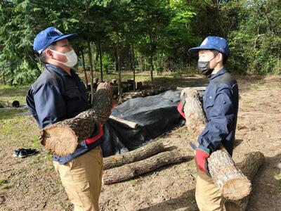 昨年の秋に演習林で伐採したクヌギ原木にしいたけの種駒を打ち込みました