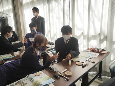 セミナーの後は双方の高校がプレゼンテーションを行い、本校からは林業科学科の清原さん、佐伯さん、上田さん、境さんが日頃の取組などを紹介しました。