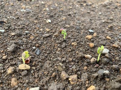 種まきは30cm間隔で、3粒ずつ点まきしました。
