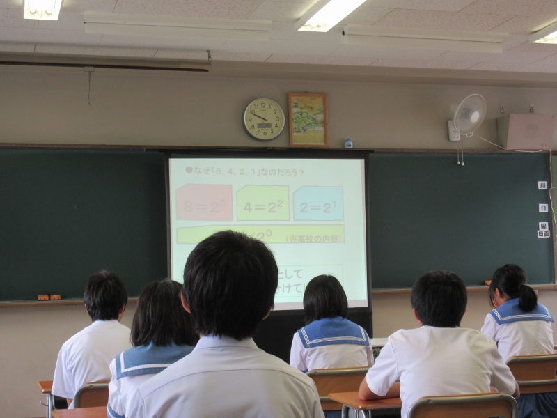 普通科は、学科説明の後、「数当てクイズ」「二進法について」の授業をしました。