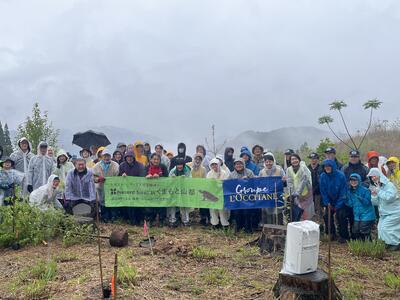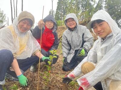 協賛されているロクシタンジャポン様やジェットスターの会長・社長・社員の皆様、そして熊本県副知事や山都町長らも参加され、あいにくの雨ではありましたが、林業科学科森林保全班の生徒が育てたクヌギの苗も提供し、一本一本大事に植樹しました