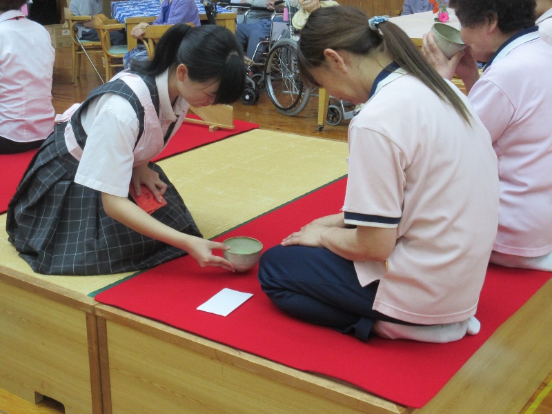 今週、矢部高校茶道部の部員が、浜美荘とライフライト矢部でボランティアお茶会をしました。
