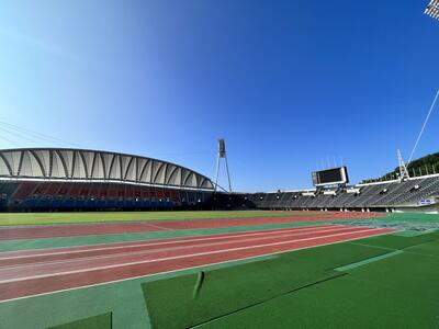 今日(26日)は会場の「えがお健康スタジアム」で事前準備と測点杭の設置を行いました。