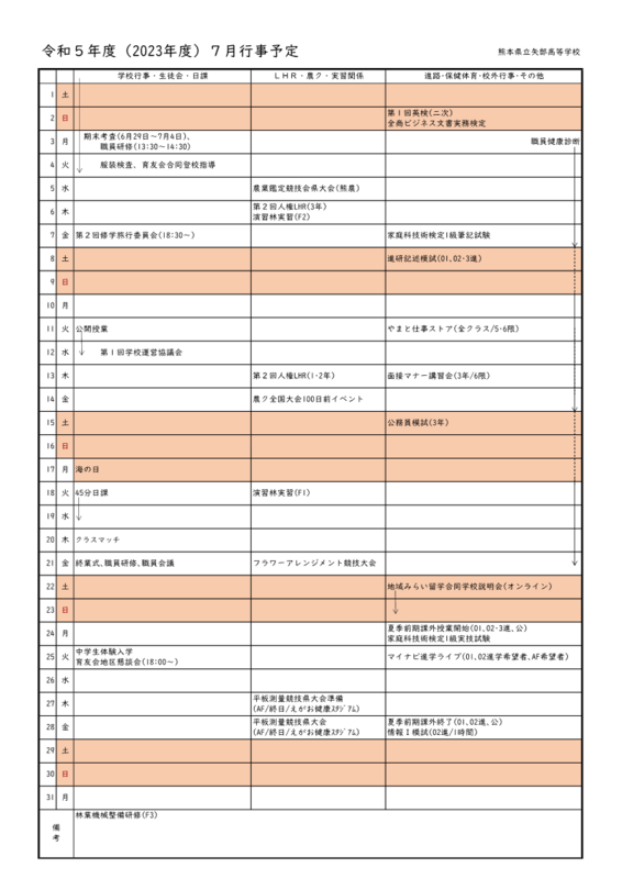 令和5年度(2023年度)7月行事予定 投稿日時 : 2023/06/23 事務 カテゴリ:行事予定 7月の行事予定になります。 諸事情により学校行事・日程等が変更される場合があることを申し添えます。 R5 07月行事予定.pdf 0 {{options.likeCount}} {{options.likeCount}} {{options.unlikeCount}} {{options.unlikeCount}}