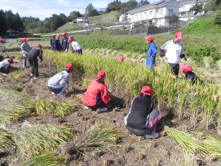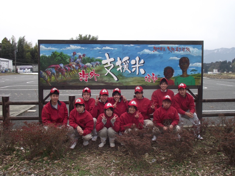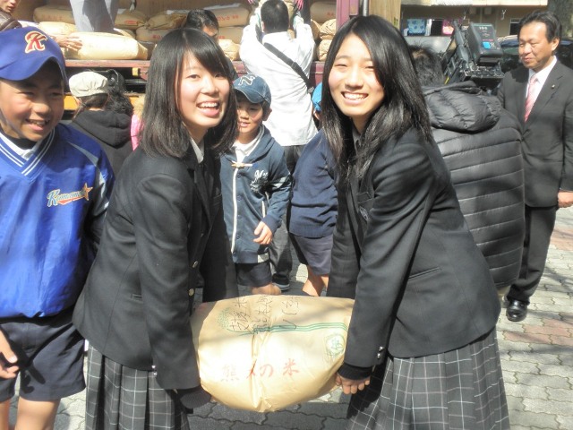 食糧難に苦しむ国々に米を送る「アジア・アフリカ支援米」の出発式が22日(土)、熊本市西区の古町小学校で行われ、本校からも生徒が参加しました。午前中に生徒たちが一生懸命育て、収穫したお米(約500㎏)を会場まで運びました。今回は県内の8カ所の農地で、小学校や本校で穫れたお米約2トンがカンボジアに送られます。