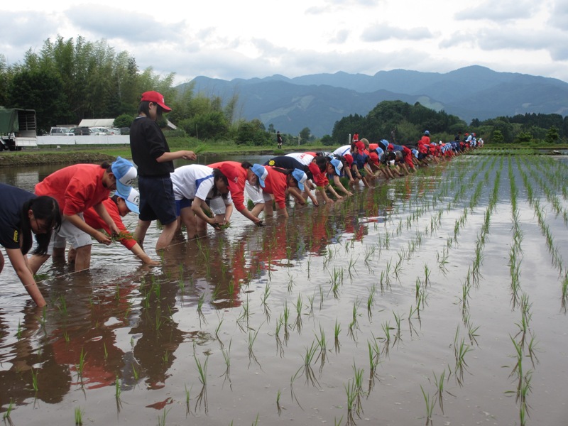 田植えの様子(食農科学科だけでなく、1年生全員で行いました。)