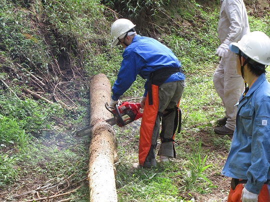 実際に山へ行きチェーンソーを使っての実習などをしました(^∀^)