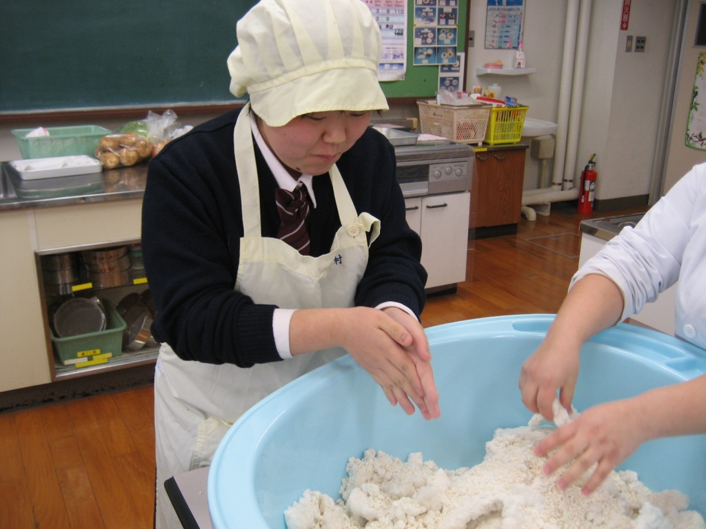 米こうじを手で細かくくだき、塩を混ぜます。これを『塩切りこうじ』といいます。