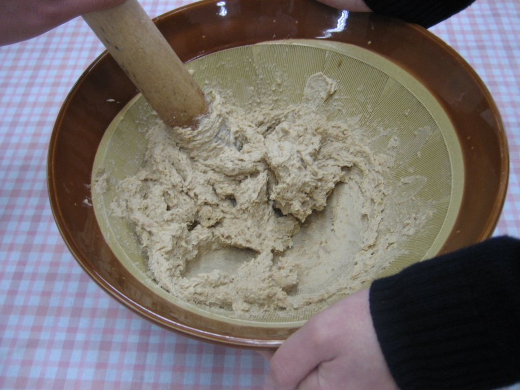 やわらかく煮た大豆をすり鉢でつぶします。つぶした大豆に塩切りこうじを混ぜ合わせ、大豆の煮汁少々加えます。