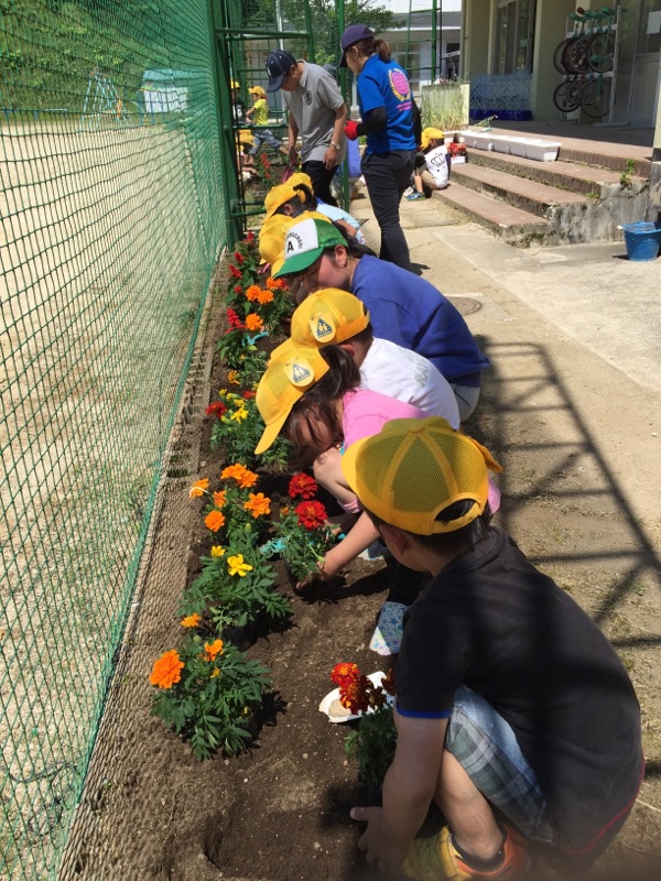 潤徳小学校の全校児童と、食農科学科草花専攻の3年生5名で矢部高校で生産した草花の花植え指導を行いました。
