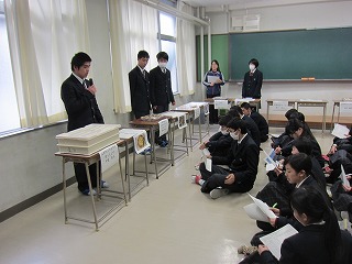 1月23日(火)に食農科学科3年食生活コースの課題研究発表会を実施しました。食生活コースでは「課題研究」の授業を通して、山都町の特産物であるユズやブルーベリー、お茶などを活用した料理や菓子の製造に取り組みました。