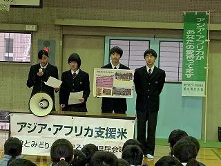 アジア・アフリカ支援米の取り組みは県内各地で行われており、今年度県内全体では1680kgが集まったことを知りました。今後とも少しでも飢餓に苦しんでいるアフリカの国々の人々に役立つために取り組みを継続していきたいです!