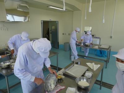 今年度はじめての製造実習で、はじめは少し緊張した様子でしたが、指導を受けながら生地を絞っていきました。