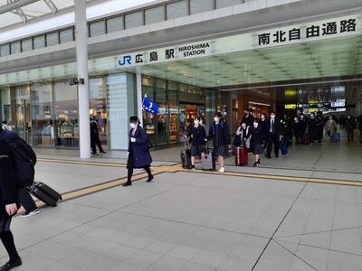 学校から熊本駅にバスで移動し、予定通り新幹線で広島に到着しました。