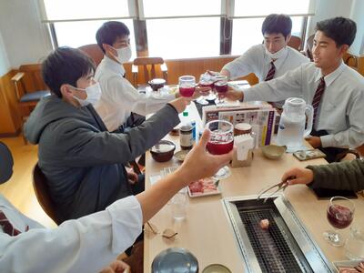 昼食は三次ワイナリーにて、ブドウジュースで乾杯し、焼き肉をいただきました。