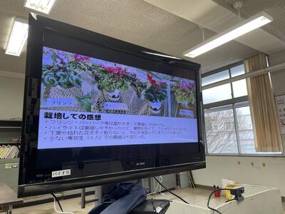 今回は各学校のシクラメン栽培の様子やスマート農業の取り組みについて、オンラインで発表し合いました。
