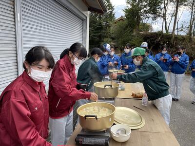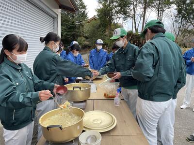 式典後は野菜専攻が栽培した大根や白菜を使って、豚汁を作り、新型コロナ感染拡大防止に努めながら会食しました。