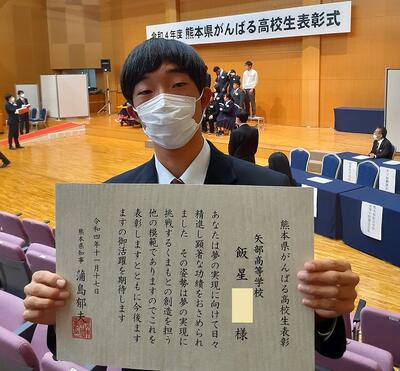 今年度の「熊本県がんばる高校生表彰式」が行われ、普通科3年ビジネス類型の飯星くん(矢部中出身)が表彰を受けました。