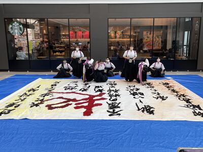 オープニングは、御船高校の書道パフォーマンスでした。 完成した作品に多くの方々が魅了されました。