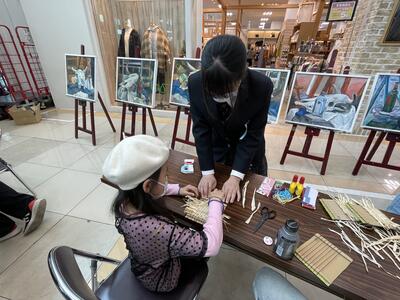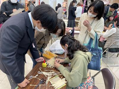 ワークショップでは、 トウモロコシの皮を活用したコースター製作体験を行いました。 食農科学科1年生の授業では、 春から夏かけてトウモロコシを栽培しました。 そのトウモロコシの皮を乾燥させて、編んでいく体験です。 たくさんの方々に体験していただくことができました。