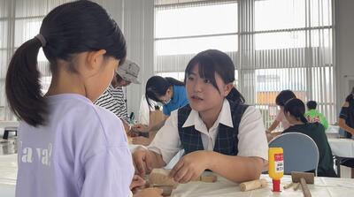 このイベントは、保・幼稚園や小学生などに木を使ったものづくりを体験してもらうことで、原体験をとおして心を育てることや五感を働かせて木の魅力に触れてもらうことを目的として熊本ものづくり塾が主催しています。イベントに参加した子供たちにやさしく作り方を教える生徒の様子が見られました